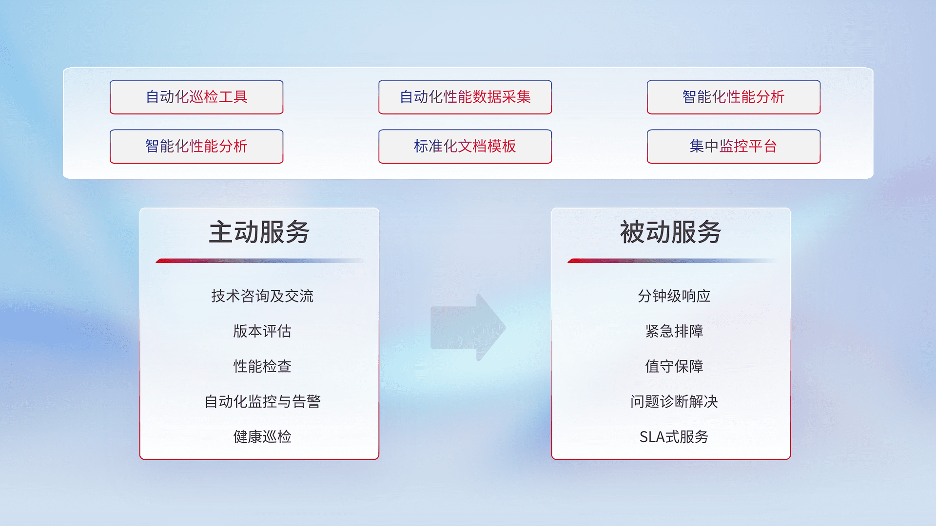 智能化工具和标准化文档,,保障服务质量,,,,提供主动服务(包含技术咨询、、版本评估、、、性能检查、、、、自动化监控与告警、、、、健康巡检)和被动服务包含(分钟级响应、、、紧急排障、、、值守保障、、、、问题诊断解决、、、、SLA服务)。。。。