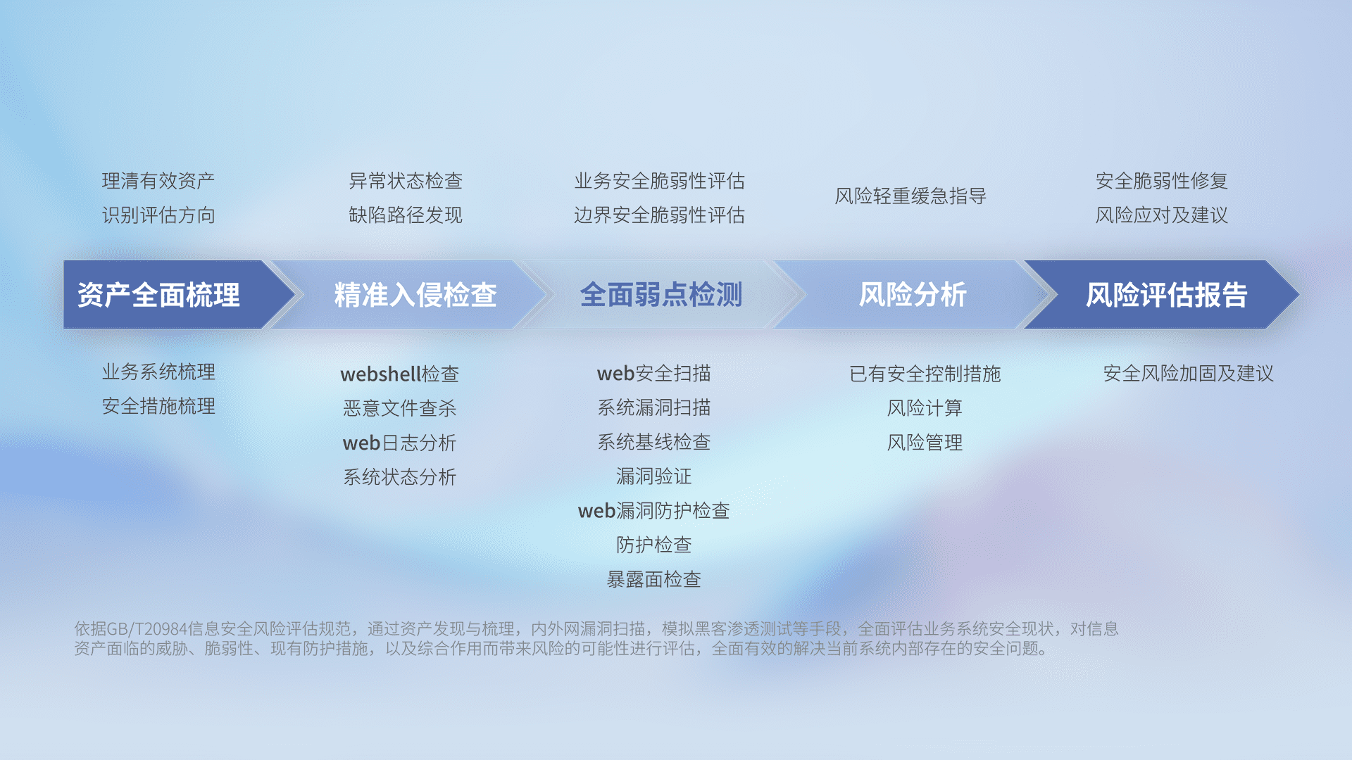 针对客户行业特性,,,,以专业的安全服务+多厂商联合解决方案提供专属的一站式安全管理服务,,,,帮助客户全面感知网络空间威胁,,,,基于识别、、、检测、、分析、、、、防护、、监测、、、响应的服务理论模型,,从方案咨询、、、集成交付、、、、评估验证、、优化加固、、运维运营,,致力于为客户提供完整的闭环管理式安全服务。。以实战经验为客户打造高抵御风险的安全体系,,,,帮助客户发现威胁、、对抗威胁、、处置威胁,,,不断积累安全对抗能力,,,持续保障数字化安全。。。。