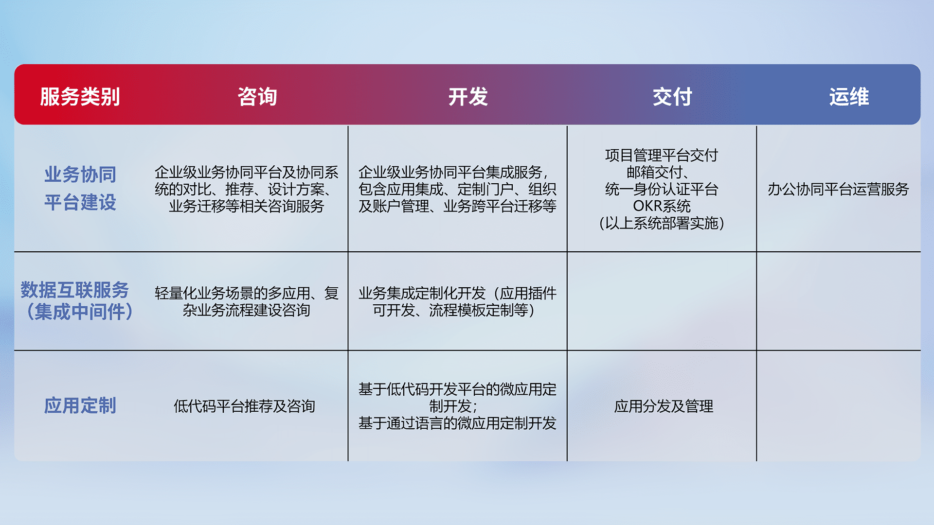 针对钉钉、、、企微、、IDaas等平台级产品提供产品的规划、、方案、、、交付、、定制化开发等服务,,,,实现如统一协同办公、、、、智能客户服务、、、、混合会议管理、、智能数据查询、、、等业务场景,,,实现数字化转型。。。